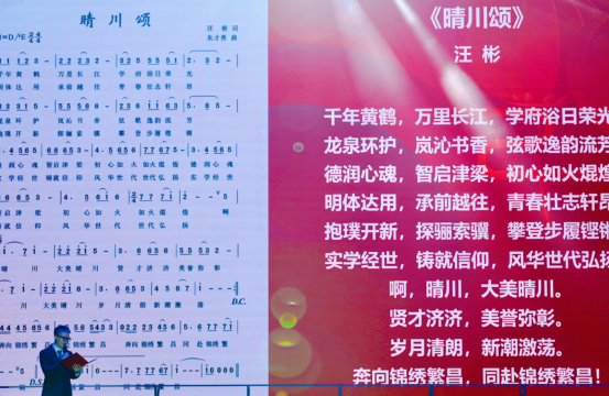 (通讯员:姚瑶 刘蕾)“千年黄鹤,万里长江,学府浴日荣光。龙泉环护,岚沁书香,弦歌逸韵流芳……”9月28日晚,武汉晴川学院体育馆内,青春律动,歌声如炬。在该校一年一度的“迎新生、庆国庆”金秋文艺晚会上,武汉晴川学院校歌《晴川颂》重磅发布。这首由该校董事长、校长汪彬教授执笔作词,著名作曲家朱才勇先生谱曲的校歌,以诗意的笔触与昂扬的旋律,深情诠释了学校的办学特色与时代使命,成为校园文化品牌建设的又一硕果。