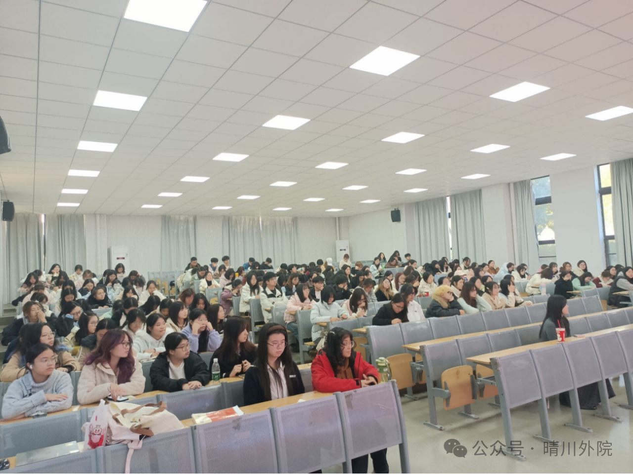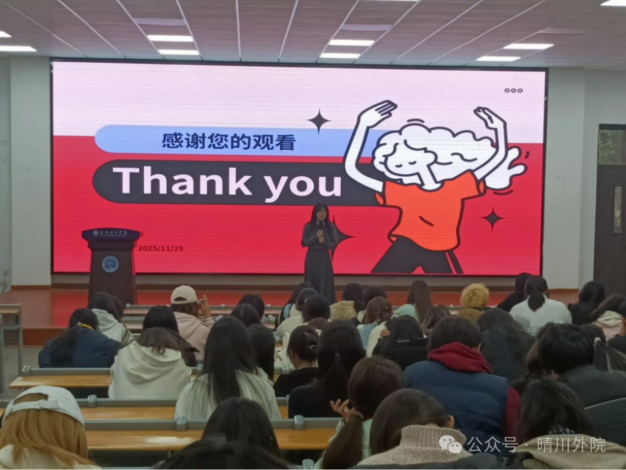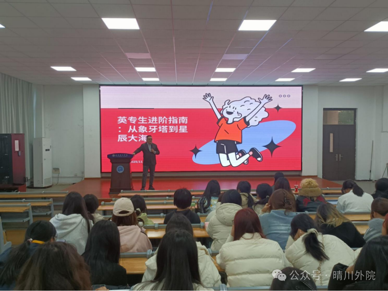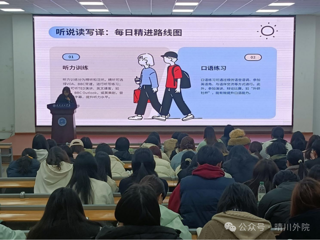 外国语学院翻译教研室黄欣老师以“英语专业人才成长路径”为主题,从“良师益友”的角度出发,为同学们解析了外语类专业考研的最新趋势,并为新生送上“学习锦囊”。她强调,扎实的语言基础、跨学科的知识储备以及良好的心理素质是考研成功的三大支柱,并鼓励同学们在日常学习中注重积累,拓宽视野。她还详细分享了自己的学习经历和成长过程,引起了同学们的深度共鸣。