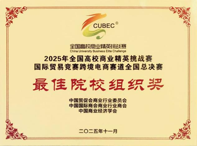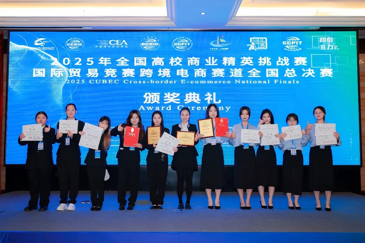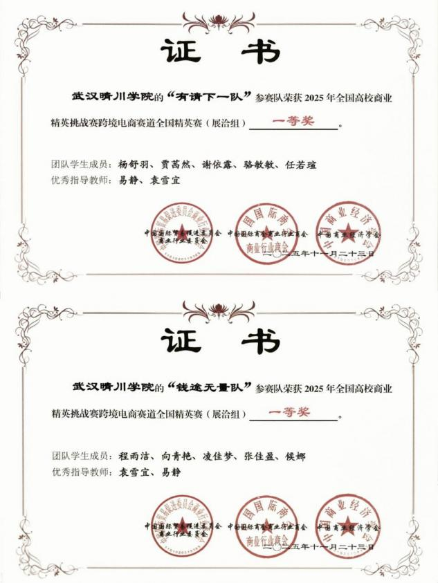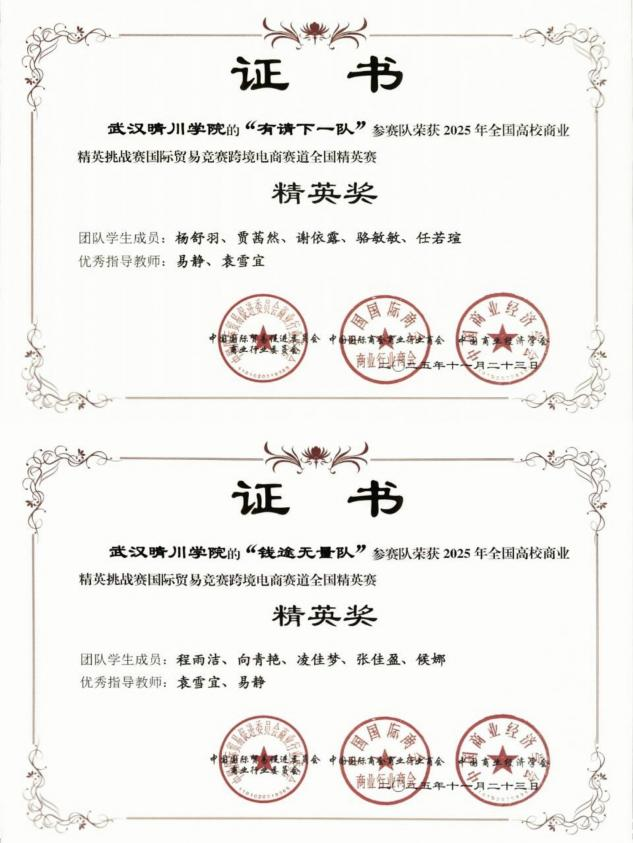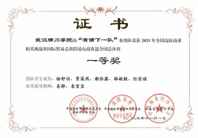 (来源:外国语学院 编辑:刘小丹)近日,2025年全国高校商业精英挑战赛国际贸易竞赛跨境电商赛道全国精英赛圆满落幕。本届赛事共吸引来自全国近500所高校、5000余支队伍报名参赛,经过知识赛、校赛、省赛和国赛的层层选拔,最终60余支顶尖团队齐聚全国总决赛。武汉晴川学院外国语学院的“有请下一队”和“钱途无量队”在指导老师易静、袁雪宜、李晶的悉心指导下,在全国众多高校队伍的激烈角逐中脱颖而出,双双斩获2025年全国商业精英挑战赛国际贸易竞赛跨境电商赛道全国总决赛一等奖、全国精英赛精英奖,全国精英赛(展洽组)一等奖,武汉晴川学院获“最佳院校组织奖”荣誉称号。
