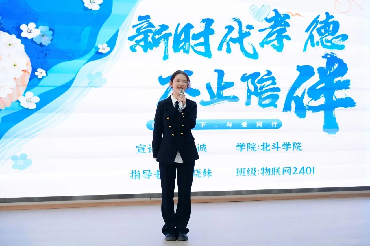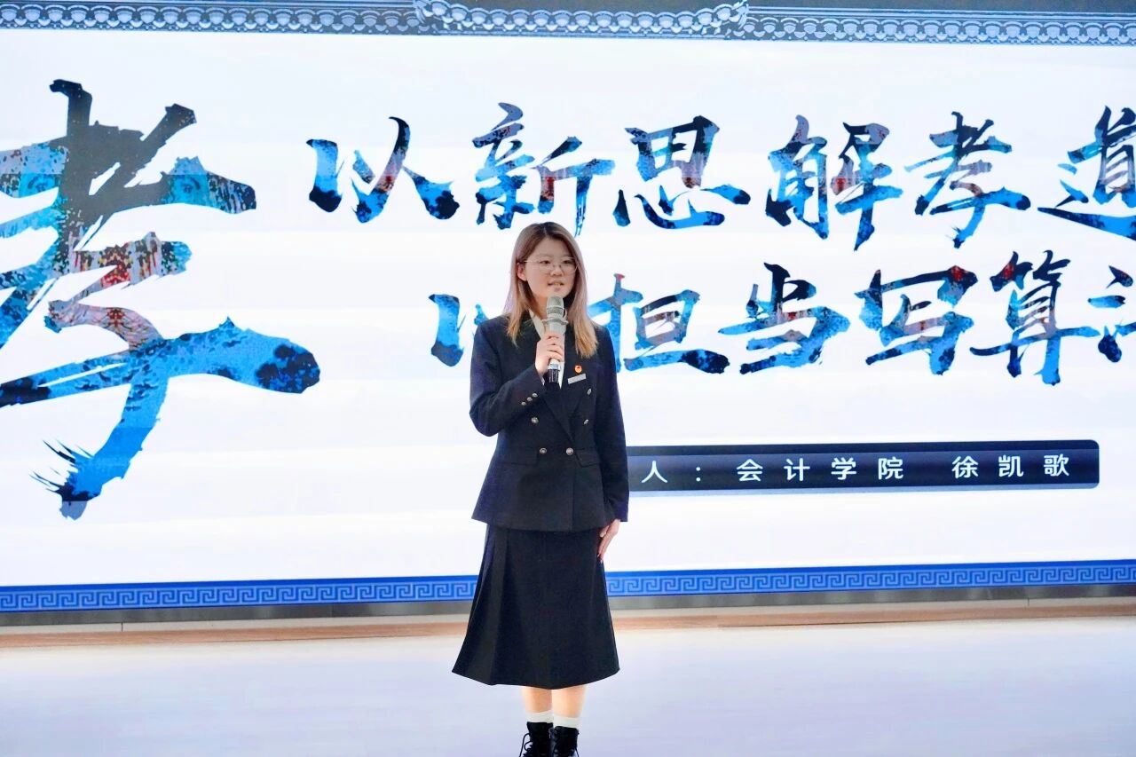 此外,传媒艺术学院高雅书呼吁“孝在当下”,设计工程学院叶美希描绘“山海不及”的亲情,计算机学院王诗博以古鉴今阐述孝道历久弥新,传媒艺术学院陈慧系统解析“看见、懂得、成为”三重境界,北斗学院郭佳诚分享以智慧跨越距离的尽孝实践,会计学院徐凯歌则反思孝心难以量化的情感本质。九位讲述者以真挚语言与鲜活故事,共同勾勒出一幅融传统底蕴与时代气息于一体的孝德实践画卷。