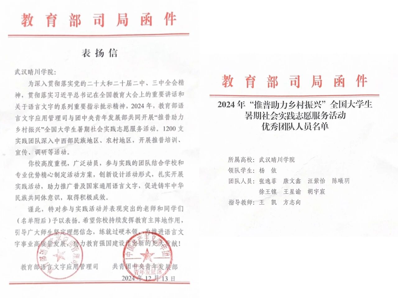 △ 武汉晴川学院“熠艺声辉”推普实践团受到团中央、教育部联合表彰